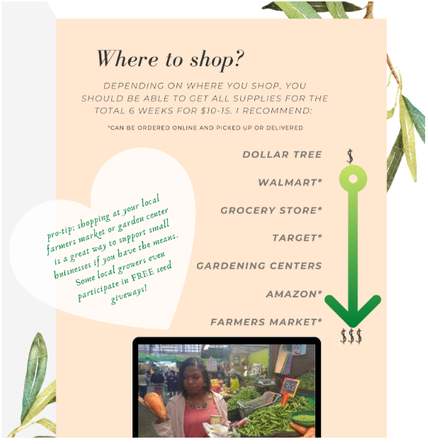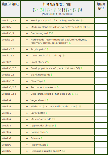Here’s what you’ll need for Week 1. As a free alternative to a small pot, you can use a cup, recycled egg carton, or clean jar.
